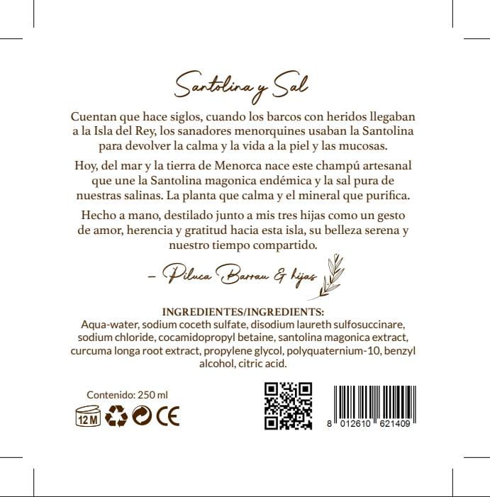 Elaborado a mano por Piluca Barrau y sus hijas, este champú une la pureza de la sal de Menorca con las propiedades calmantes y reparadoras de la santolina, una planta endémica del Mediterráneo que crece bajo el sol menorquín.